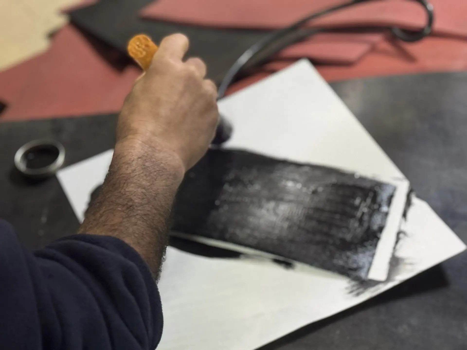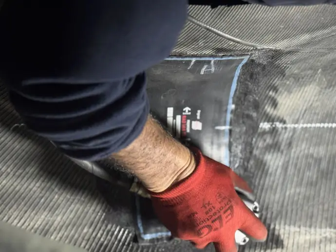 La pose dépend du type d’emplâtre : s’il est brut, dissolution puis séchage et gomme de liaison sont appliqués ; s’il est pré-liaisonné, la pose peut être directe selon préconisations. L’emplâtre est centré par rapport aux repères de préparation puis moleté du centre vers les bords, afin d’assurer une adhérence homogène. Sur certaines applications (PL, manutention, agraire, GC), un rebouchage et rattrapage du profil intérieur peut être nécessaire pour une pose correcte.